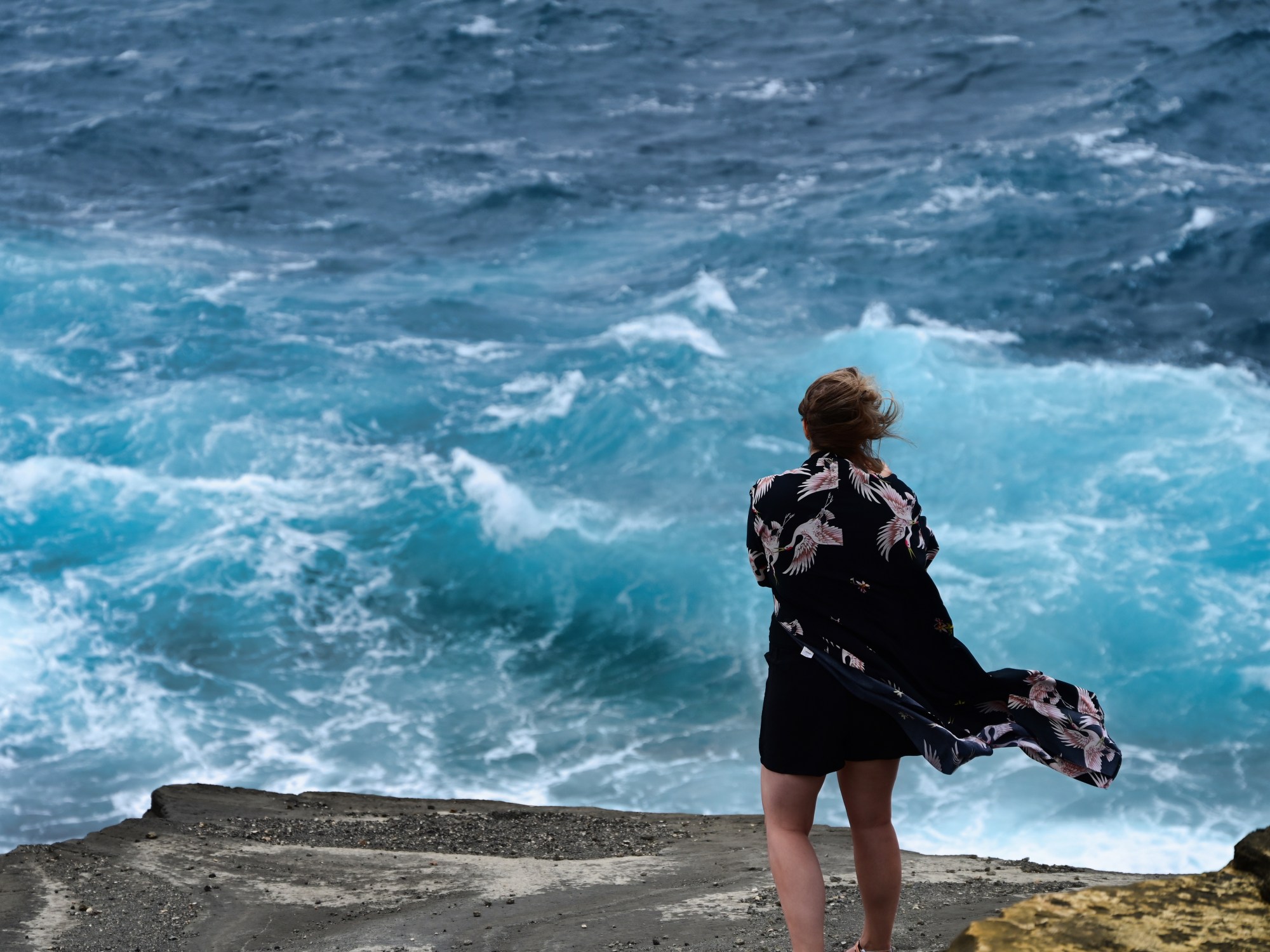 Many people were venturing to the edges of the cliffs over the raging ocean. I was not so adventurous, but this photo was of someone who was braver. Really, she wasn’t even one of the people who go to the very edge. Apparently there was a cliff collapse as recently as 2022, so go to the edge at your own risk! When I took this photo I had to take a stance against the wind so I wouldn’t shake the camera. There was not only wind blowing, but we were also getting pelted with tiny pieces of sand and salt spray.