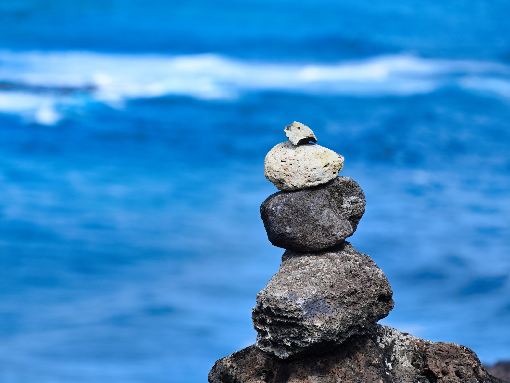 Stacked stones can have many different meanings. In some cases they are used as navigational aids. Other times they mark the high point of a mountain or the location of a resource like water. I’ve read that they can bring a sense of peace or good luck. Whatever these stones mean, I thought they were amazingly perched atop a rock and looked good against the backdrop of the ocean.
