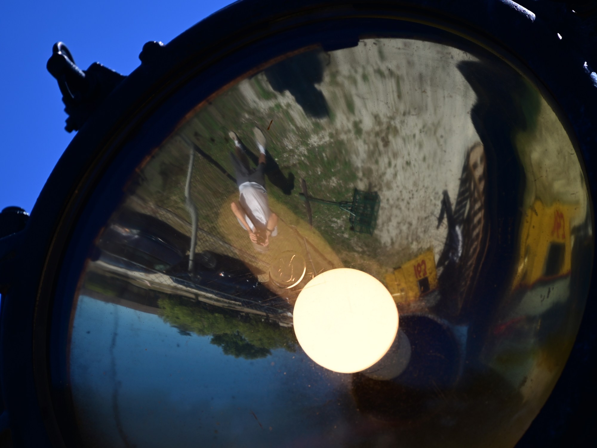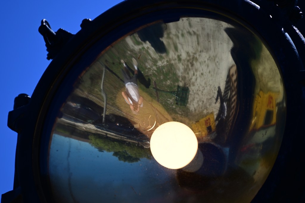 I think it’s fun that you can see me taking the photo in an upside down reflection in the top of the mirror. Honestly, the photo is a little bit of a mess, but I like the light, the dark metal of the enclosure, the deep blue of the sky, and then the funny little world that appears inside.